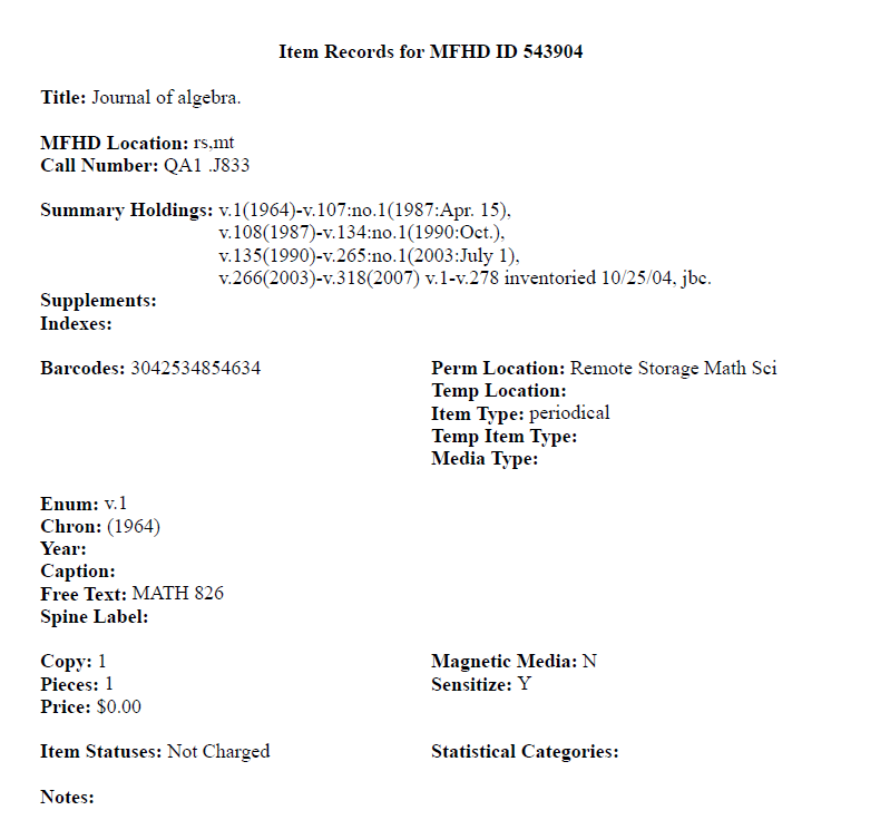 The program in action on my catalog: Journal of algebra